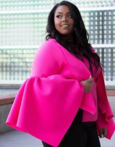 Inspiration: Hypatia is the statement garment of this collection. Hypatia of Alexandria is largely regarded as the first female astronomer. This garment was inspired by my fellow bloggers and influencers. Like Hypatia, they are forging their own paths and inspiring others to do the same by leading a style revolution for plus sized women. The bright pink color represents their light and love as leaders of the community and the statement sleeves are a tribute to their willingness to step outside the box. Hypatia is for you, my colleagues and constant inspiration.