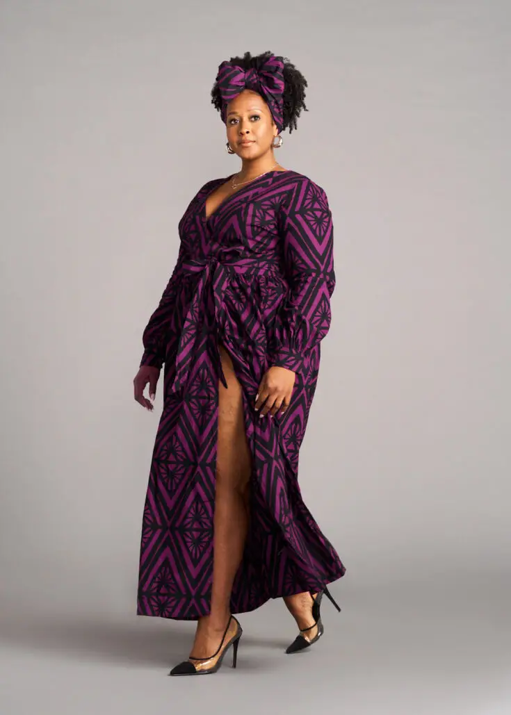 Make a bold entrance in the Rehema dress from D’IYANU. This faux wrap maxi features a curve-celebrating silhouette with a cinched waist sash and statement puff sleeves that bring the drama. Crafted in a vibrant African print, it’s a perfect mix of regal and contemporary—ideal for weddings, cultural events, or whenever the moment calls for extra flair.